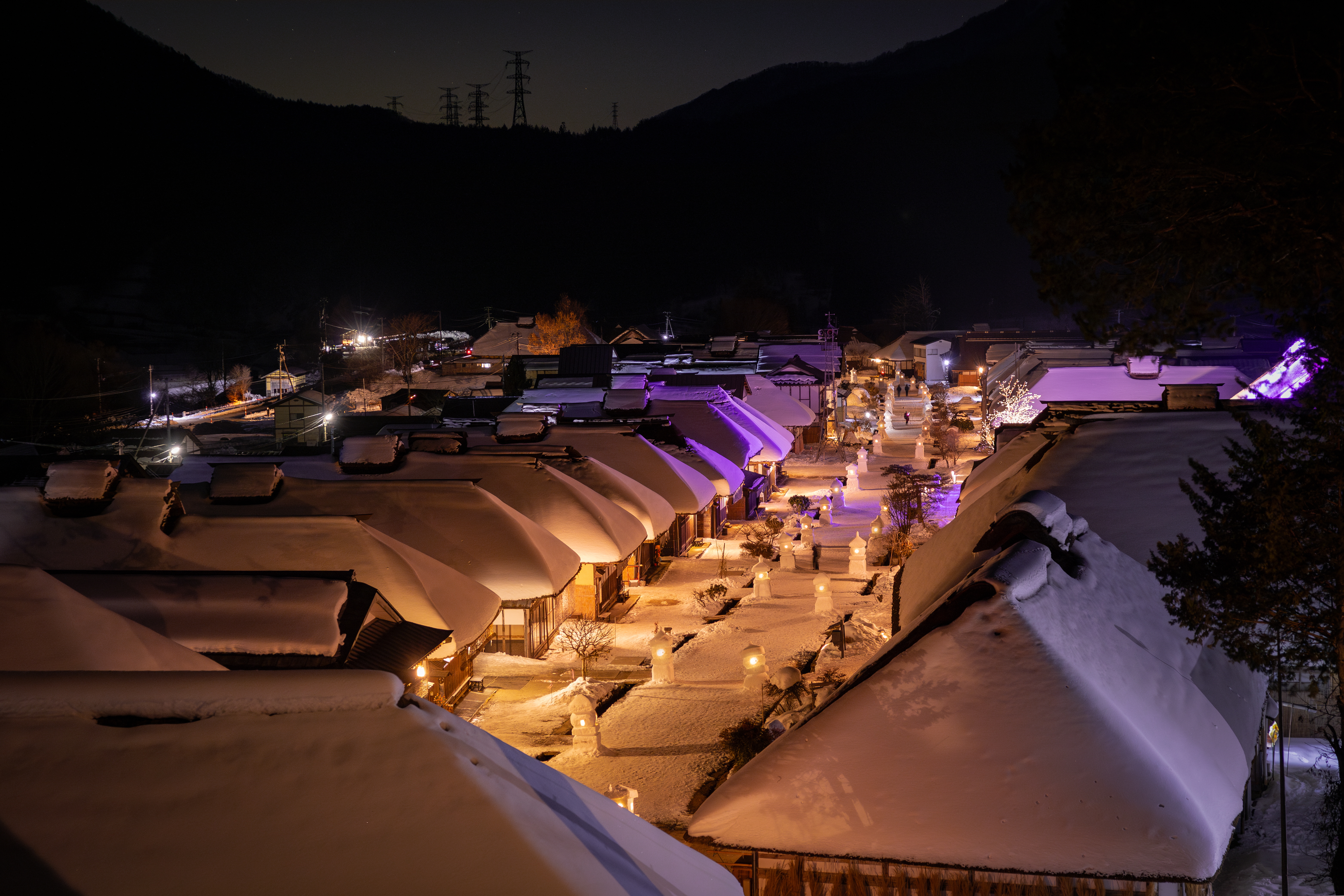 手づくりの雪灯籠が通り沿いに並び、約500mにわたる宿場町全体が、幻想的な夜のフォトスポットへと姿を変えます。