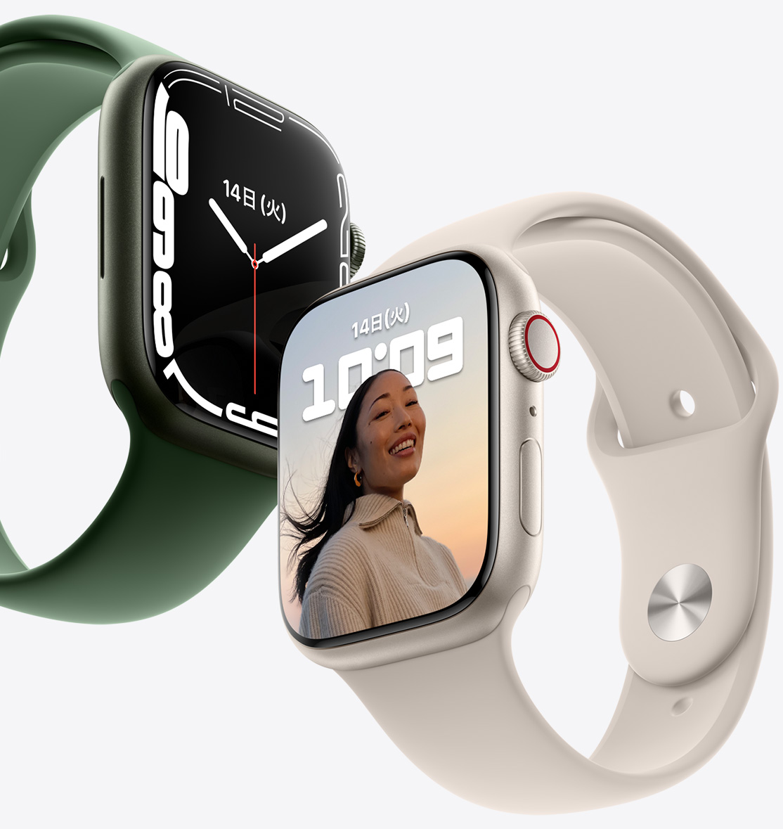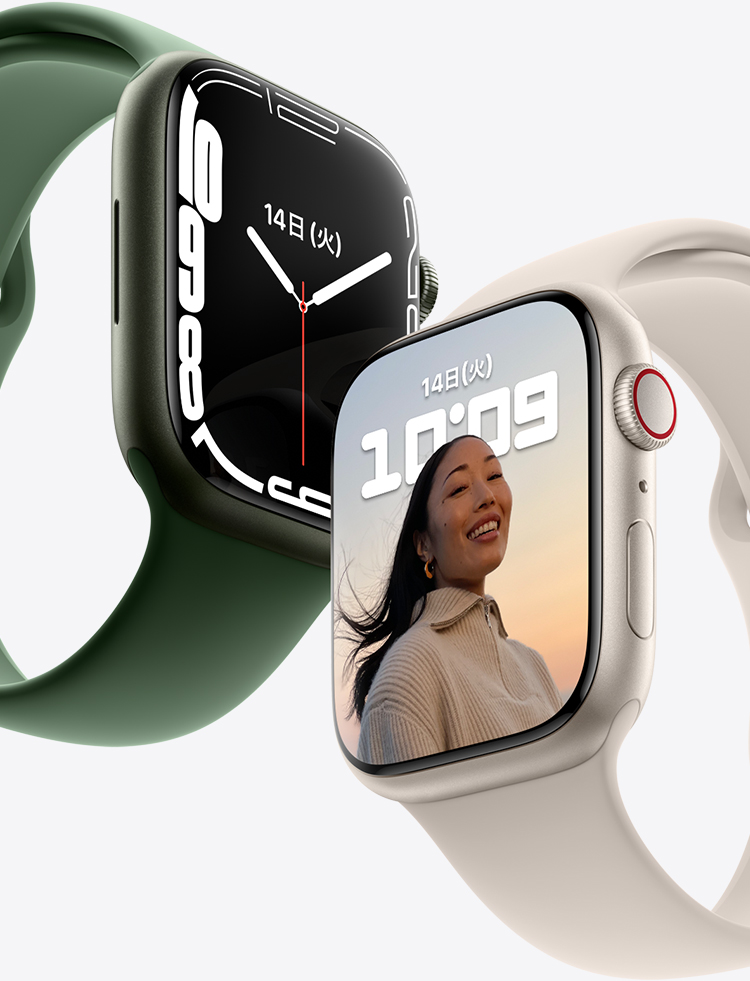 Apple Watch磁気高速充電USB-Cケーブル(モデルA2515)とApple 20W USB-C電源アダプタ(モデルA2305)を接続したApple Watch Series 7(GPSモデル)とApple Watch Series 7(GPS + Cellularモデル)の試作ハードウェア、Apple Watch磁気充電ケーブル(モデルA2255およびA2256)とApple 5W USB電源アダプタ(モデルA1385)を接続したApple Watch Series 6(GPSモデル)とApple Watch Series 6(GPS + Cellularモデル)を使用し、2021年8月にAppleが実施したテスト結果によります。Apple WatchはiPhoneとペアリングし、すべてのデバイスはリリース前のソフトウェアを使用してテストを実施。充電時間は地域、設定、環境条件によって変わり、実際の結果は異なる場合があります。