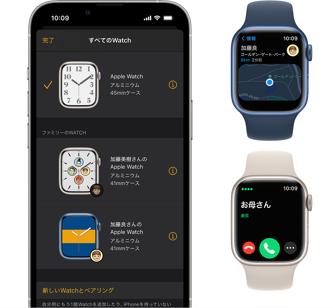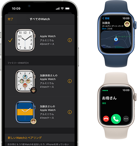 ファミリー共有設定でApple Watchを設定した場合、一部の機能は利用できません。携帯電話通信サービスを利用するには、通信サービスプランへの加入が必要です。詳しくはサービスプロバイダにお問い合わせください。対応している通信事業者と利用条件については、apple.com/jp/watch/cellularをご覧ください。
