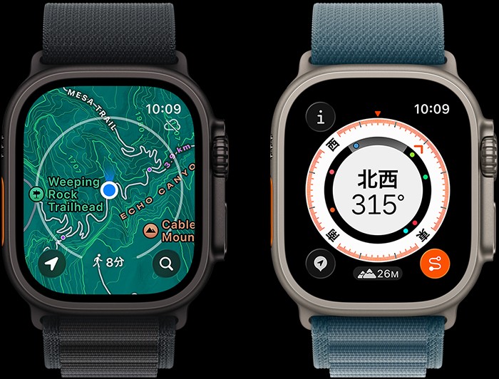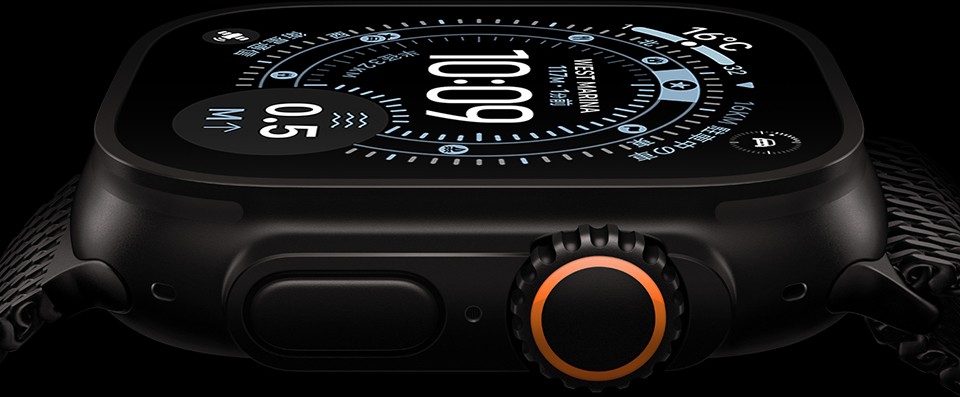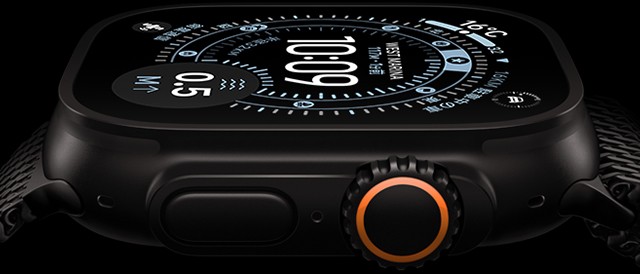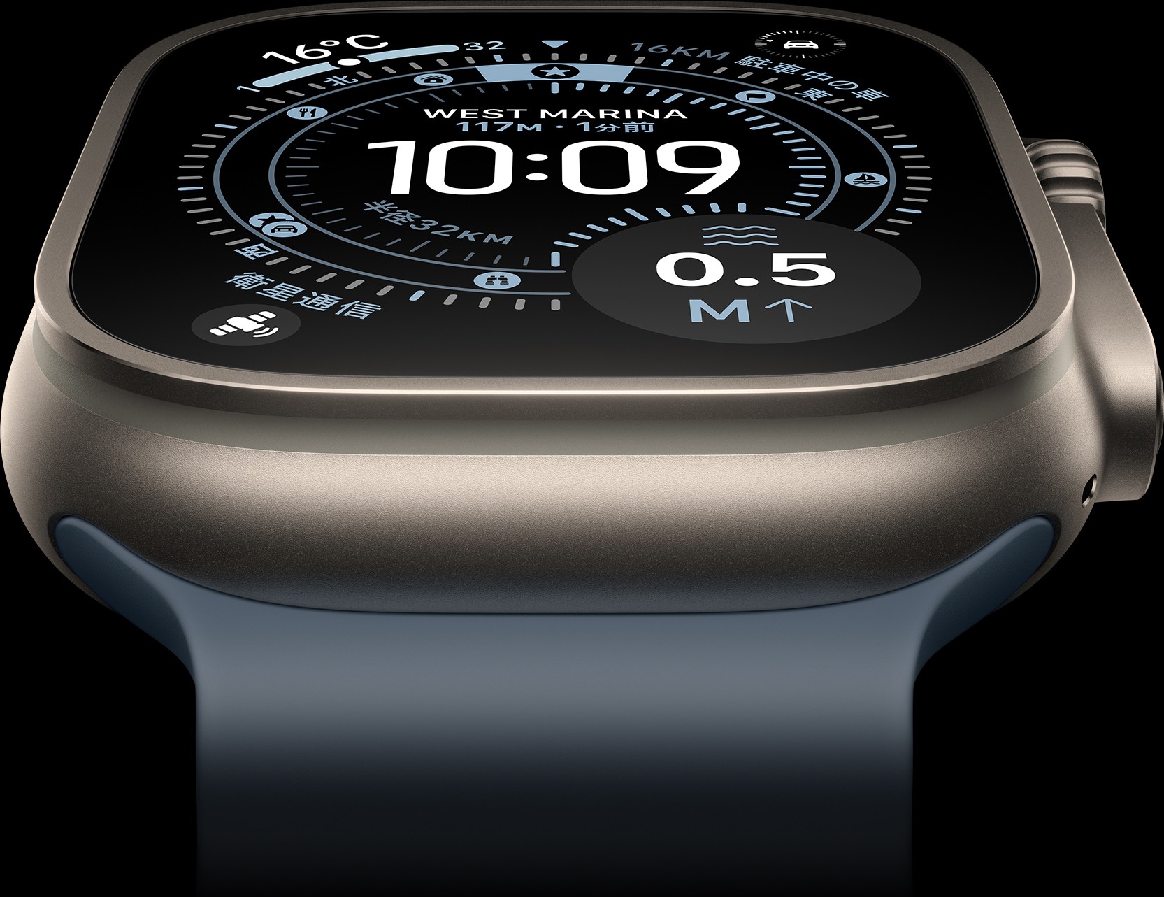 斜めから見た時の明るさが向上:着用時にディスプレイを外側に傾けた場合。Apple Watch Ultra、Apple Watch Ultra 2との比較によります。