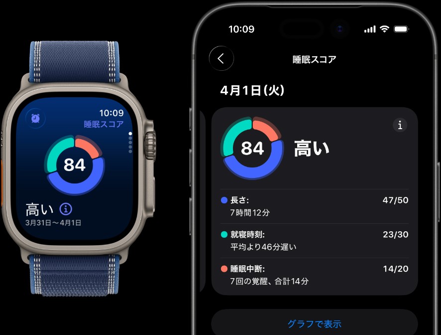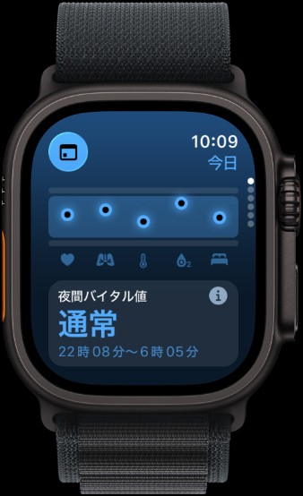 睡眠時無呼吸の通知:睡眠時無呼吸の通知機能はApple Watch Series 9以降、Apple Watch Ultra 2以降、およびApple Watch SE 3で利用できます。この機能は、睡眠時無呼吸と診断されたことがない18歳以上の方による使用を目的とし、中等度から重度の睡眠時無呼吸を示唆する兆候を検出します。販売名:Appleの睡眠時無呼吸の兆候の通知プログラム。管理医療機器販売業者等:Apple Japan合同会社(東京都港区六本木6丁目10番1号六本木ヒルズ 0120-277-535)
