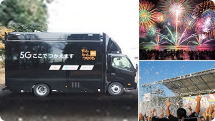 auでは、フェスや花火大会などのイベントで快適に携帯電話サービスをご利用いただけるように、車載型・可搬型の基地局で電波強化対策を行っています。