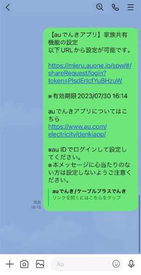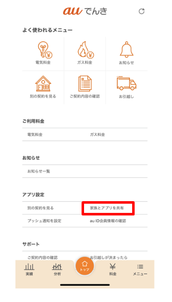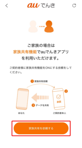 - でんき契約のみが紐づくau IDを、ご利用の通信サービス(au契約、固定通信サービス契約等)が紐づくau IDに統合すると、「家族共有機能」が自動的に解除されます。au ID統合を行った後にご家族を招待してください。