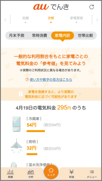お使いの家電を登録いただくと家電ごとの電気料金を推測することができます。