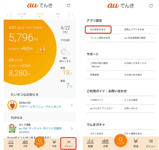 STEP 1 アプリトップ画面の右下から「メニュー」を開き「別の契約を見る」をタップします。