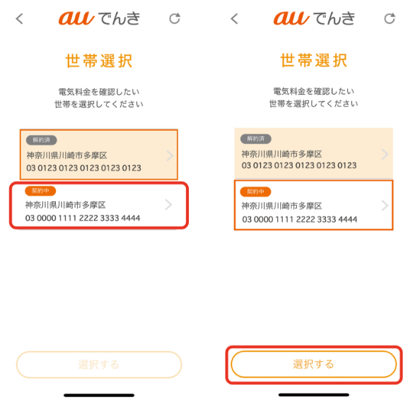 STEP 2 世帯選択の画面で「契約中」の世帯を選び、「選択する」ボタンをタップすると、世帯が切り替わります。