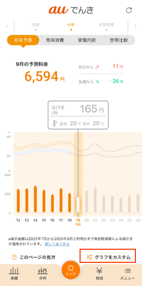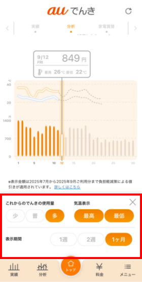 auでんきの月末予測はその月の使用目安に合わせてグラフをカスタムすることができるよ!