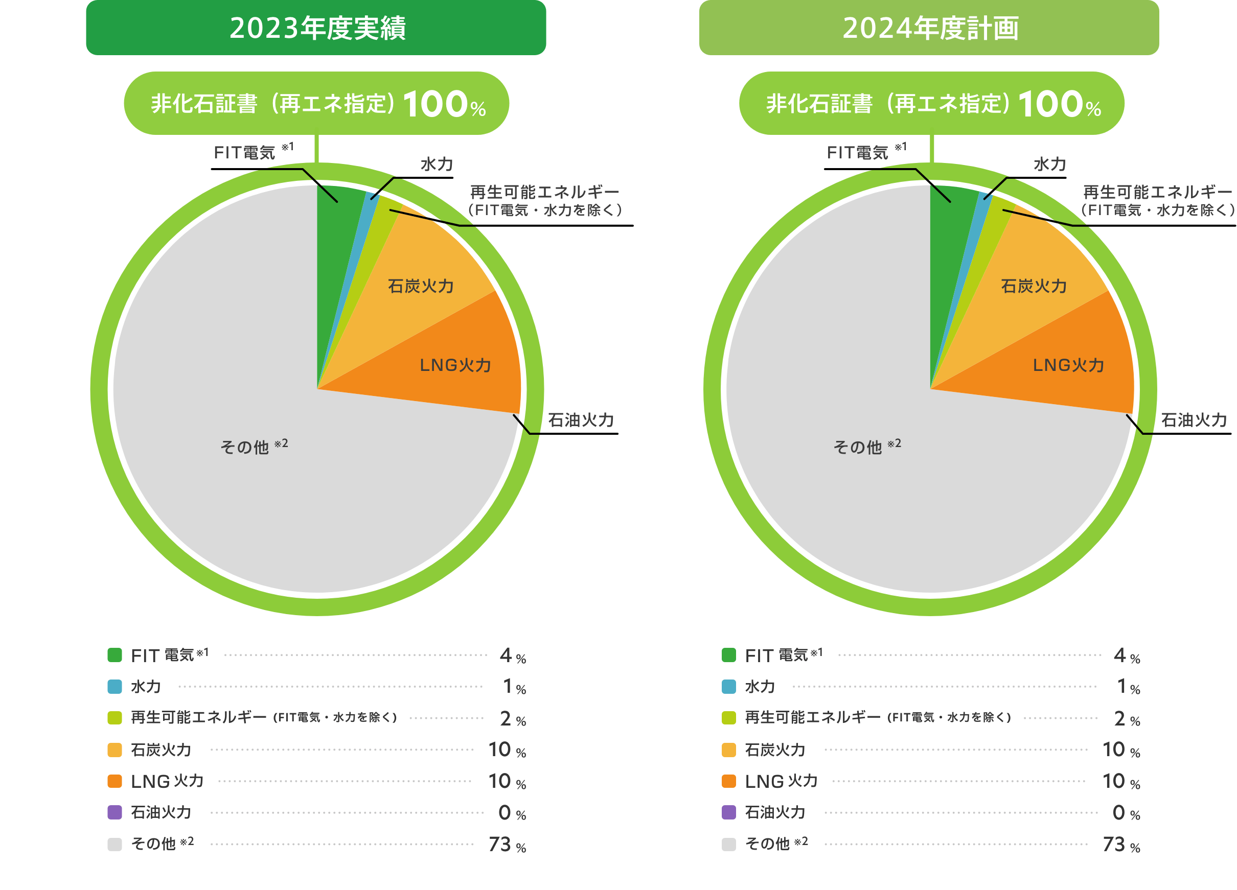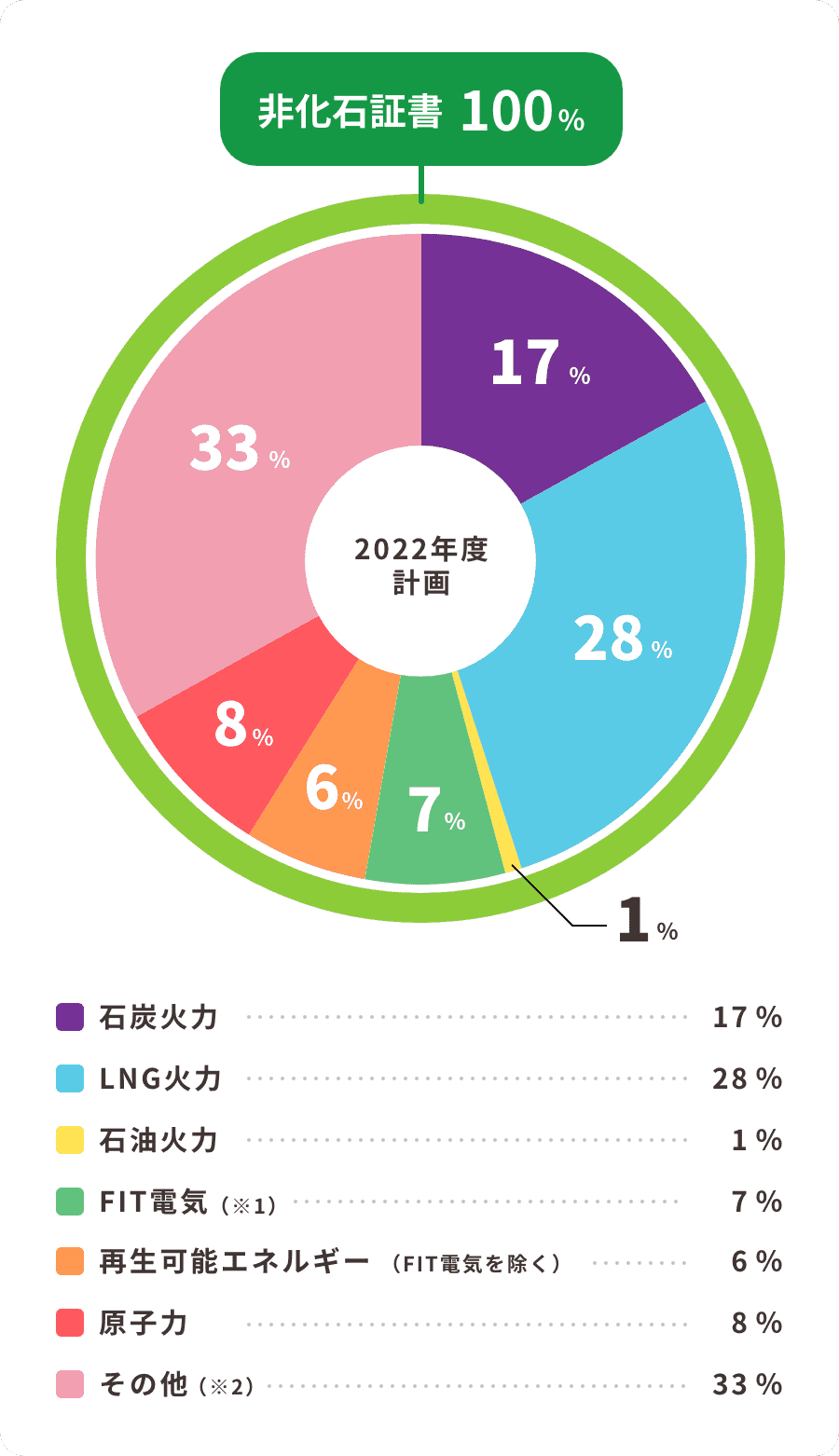 ※1:当社がこの電気を調達する費用の一部は、当社以外のお客さまも含めて電気の利用者が負担する賦課金によって賄われています。この電気は、火力電源などを含めた全国平均の電気のCO2排出量を持った電気として扱われます。
