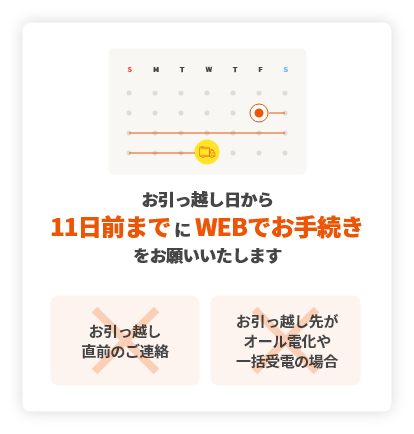 ※お引越し日までにご連絡がとれない場合は、お引越し先で電気のご利用ができない場合がございます。必ずお電話いただきますようお願いいたします。