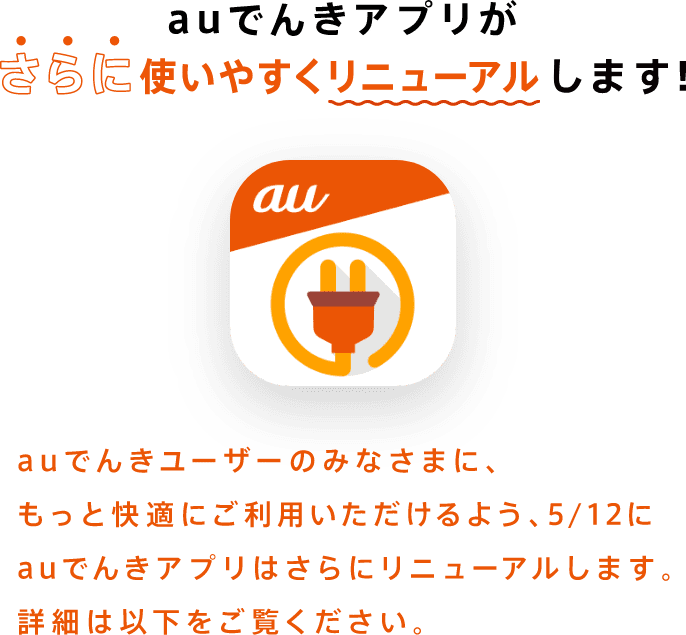 auでんきアプリがさらに使いやすくリニューアルします!auでんきユーザーのみなさまに、もっと快適にご利用いただけるよう、5/12にauでんきアプリはさらにリニューアルします。詳細は以下を御覧ください。