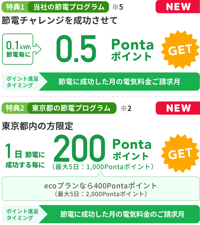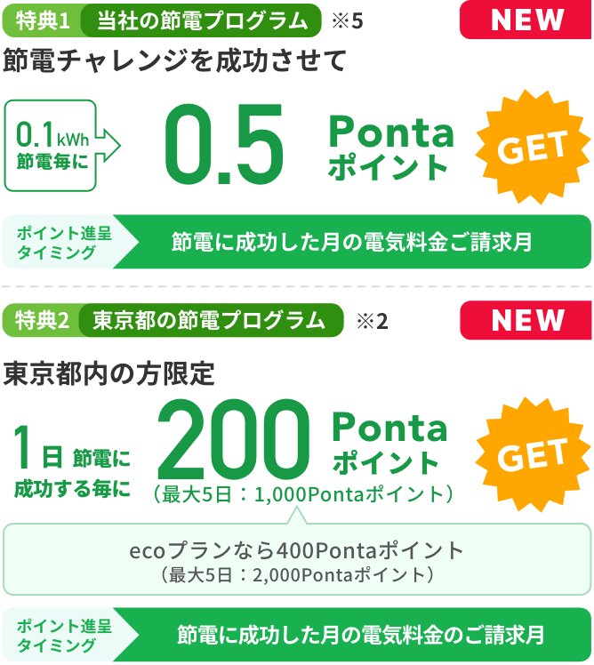 東京都の補助事業を活用し200Pontaポイント(最大5日:1,000Pontaポイント)、ecoプランご加入の場合は400Pontaポイント(最大5日:2,000Pontaポイント)進呈