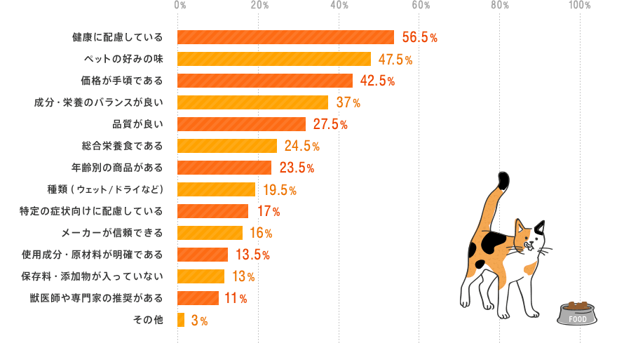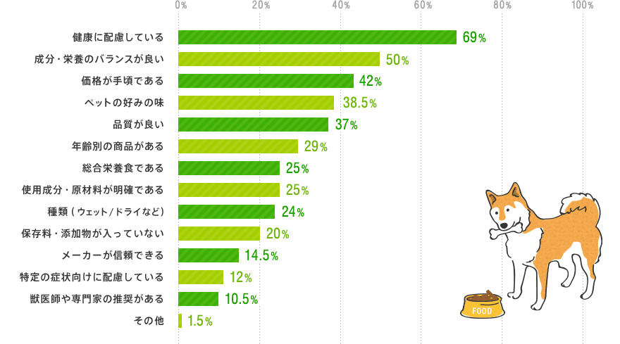 ペットフード選びで気を付けていることとして、愛犬・愛猫ともに「健康に配慮している」、「成分・栄養のバランスが良い」「ペットの好みの味」が上位を占めました。ペットたちが健康で長生きするために、体重管理をしたり、栄養があるものを選んだりと、多くの飼い主さんが、価格だけではなく品質にもこだわって選んでいるようです。