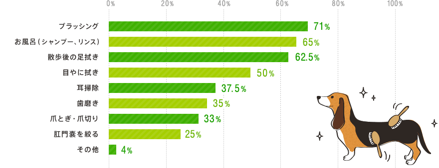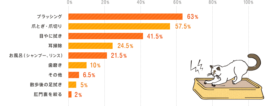 ペットのお手入れの様子を詳しく聞いてみると、みなさん毎日丁寧にケアしてあげていることがわかります。愛犬・愛猫ともに最も多かったのが「ブラッシング」。ブラッシングでノミやダニの予防をしながら、太りすぎていないか、いつもと違うところはないかなど体調管理も行っているようです。また、ブラッシングはスキンシップやコミュニケーションにもつながります。その他、愛犬のお手入れとしては、「お風呂(シャンプー、リンス)」(65.0%)や「散歩後の足拭き」(62.5%)など衛生面のケア、愛猫のお手入れとしては「爪とぎ」(57.5%)といった猫特有のケアが上位に入っています。