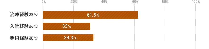 今回のアンケートにお答えいただいた400人のうち、約6割が「治療経験あり」という結果に。他人ごとではないことがわかります。また、「入院」や「手術」についても、約3割の方が「経験あり」と答えています。