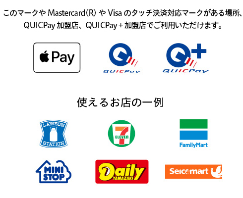 「QUICPay」や「タッチ決済」に対応している全国のお店やウェブサイトでご利用いただけます。