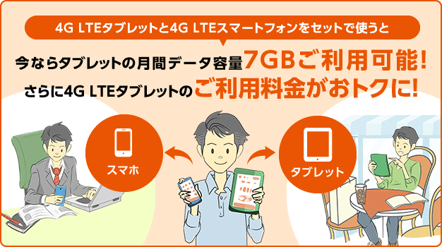 - ※14G LTEスマートフォンと4G LTEタブレットの両方を同一名義で契約すると4G LTEタブレットのご利用料金を割引します。