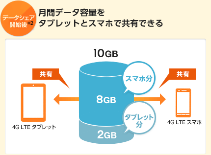 4G LTEスマートフォンの月間データ容量とタブレットの月間データ容量(2GB)を合計したデータ容量をお互いの端末でシェアしてご利用いただけるサービスです。データシェアご利用には事前の設定が必要です。