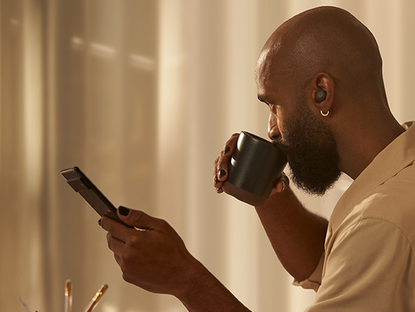 スマートフォンで音楽を聴いていたイヤホンで、簡単にノートパソコンでのビデオ通話に参加できます。マルチポイント接続機能が対応デバイス間の切り替えをサポートします1。