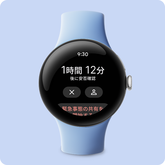 1 データ通信料が発生する場合があります。安全確認を使用するには、位置情報の有効化と、4G LTE接続またはインターネット接続が必要です。安全確認の機能は、ネットワーク接続やその他の要因によっては緊急時の通信手段として利用できないことがあります。また、一部の地域や言語ではご利用いただけません。詳しくはg.co/pixelwatch/personalsafety をご覧ください。2 転倒検出機能は一部の国ではご利用になれません。また、ネットワーク接続やその他の要因によって利用できない場合があります。スマートウォッチは、緊急時の通信手段として利用できないことがあります。転倒検出ですべての転倒が検出されるわけではありません。4G LTE接続がない状況でGoogle Pixel Watchから緊急サービスに発信するには、ペア設定したスマートフォンが近くにある必要があります。他のユーザーに現在地を共有するには、転倒検出機能に位置情報の利用を許可する必要があります。データ通信料が発生する場合があります。詳しくはg.co/pixelwatch/personalsafety をご覧ください。3 データ通信料が発生する場合があります。緊急事態の共有を使用するには、位置情報の有効化と、4G LTE接続またはインターネット接続が必要です。緊急事態の共有の機能は、ネットワーク接続やその他の要因によっては緊急時の通信手段として利用できないことがあります。また、一部の地域や言語ではご利用いただけません。詳しくはg.co/pixelwatch/personalsafetyをご覧ください。