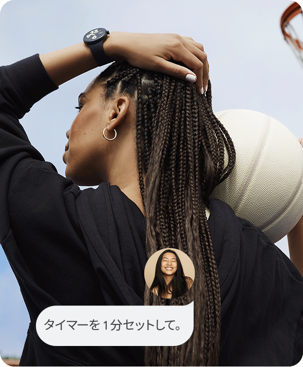 1 一部の機能には Fitbit モバイルアプリが必要です。2 データ通信料が発生する場合があります。安全確認を使用するには、位置情報の有効化と、4G LTE 接続またはインターネット接続が必要です。安全確認の機能は、ネットワーク接続やその他の要因によっては緊急時の通信手段として利用できないことがあります。また、一部の地域や言語ではご利用いただけません。詳しくは g.co/pixelwatch/personalsafety をご覧ください。3 言語によっては Google アシスタントと一部の関連機能を利用できない場合があります。対応言語の最新情報については、g.co/assistant/languages をご覧ください。