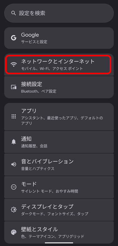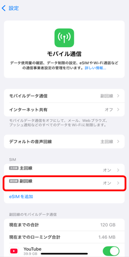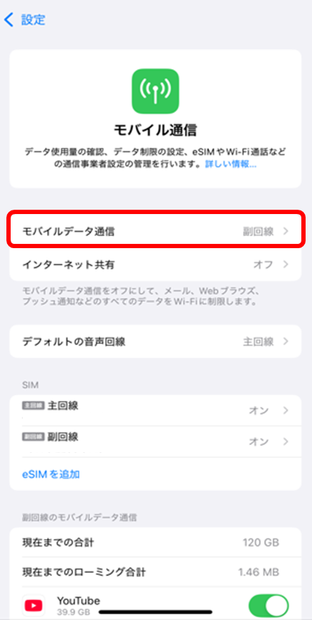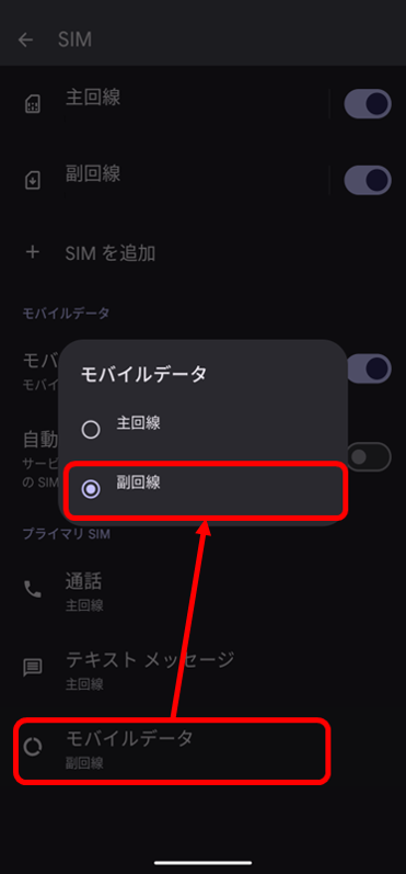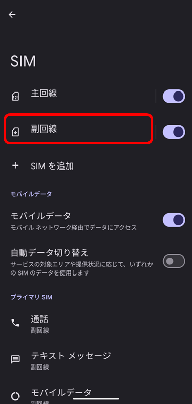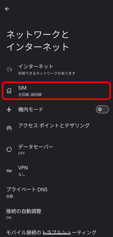(2)「設定」>「ネットワークとインターネット」>「SIM」>「ローミング」をオンにします。