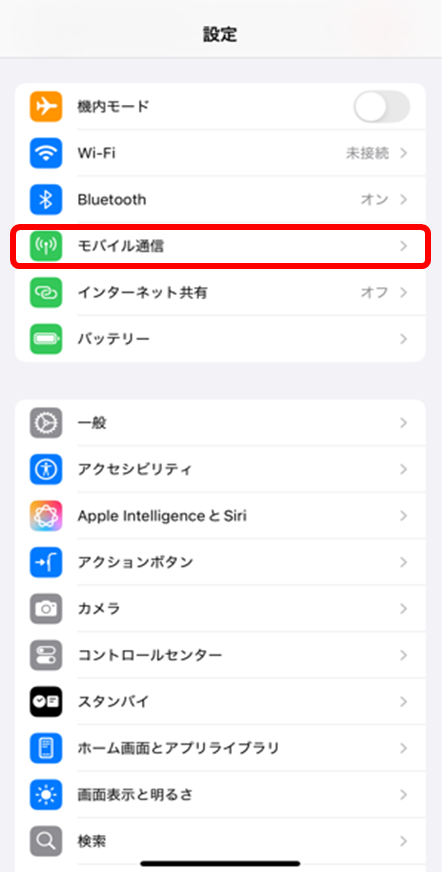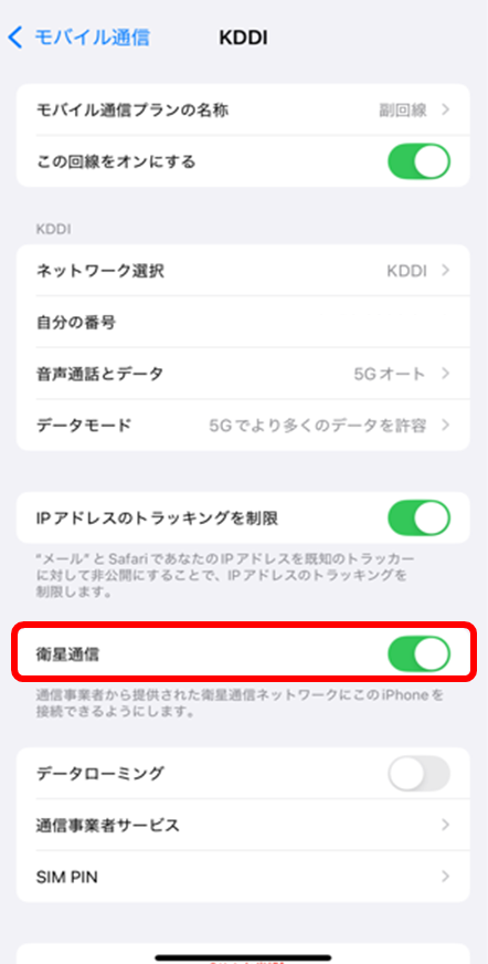 「設定」>「モバイル通信」>「モバイルデータ通信のオプション」をタップし、「衛星通信」をオンにします。