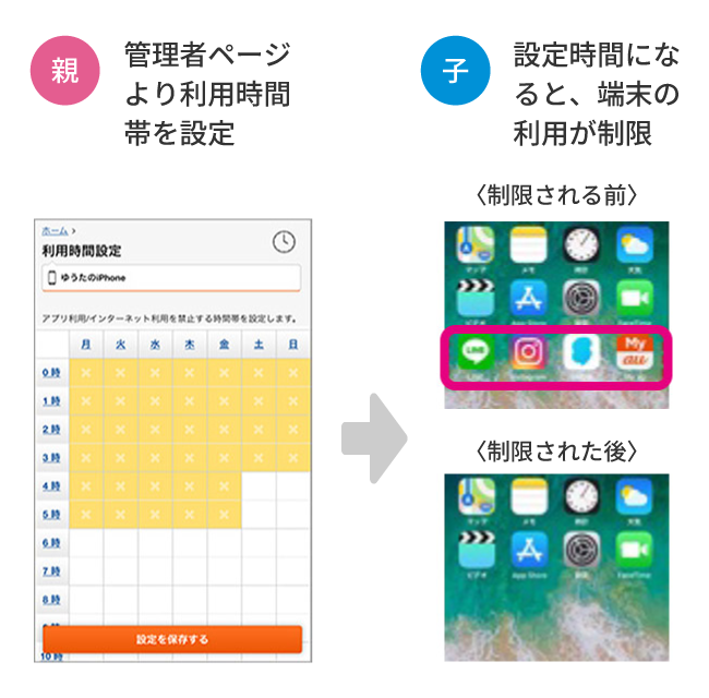 *2:App Storeからダウンロードしたアプリのみ利用が制限されます。iOS標準アプリ(電話、メッセージなど)は利用を制限できません。