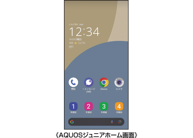AQUOSジュニアホームは、ホーム画面(デスクトップシート)とアプリ一覧画面で構成されたホームアプリです。