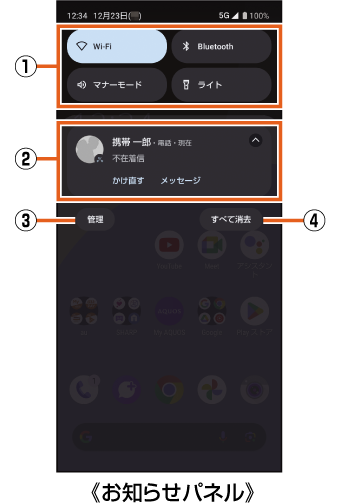 お知らせ/ステータスパネルでは、お知らせアイコンとステータスアイコンの確認や対応するアプリケーションの起動ができます。