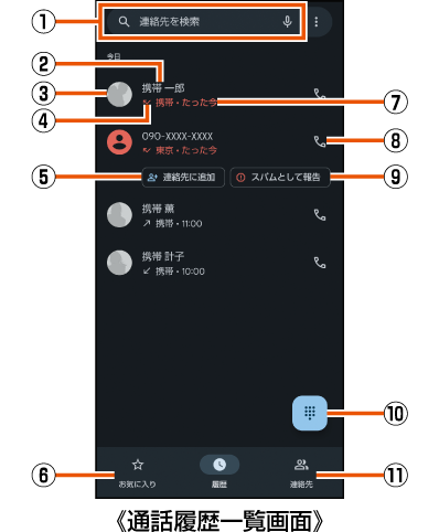 タップすると、連絡先への登録やメッセージの送信、通話履歴の詳細の確認などを行うことができます。