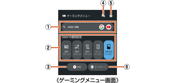 ゲーミングメニューを適用したアプリに対して、ゲーム中に通知や着信をブロックするかどうかなどを設定します。 詳しくは、「個別設定をする」をご参照ください。 |