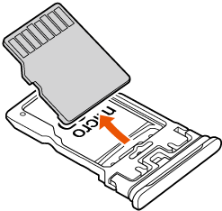 microSDメモリカードの端子(金属)面を上向きにして、SIMカード/microSDメモリカードトレイの突起部に押し当てながらはめ込む