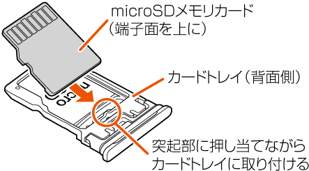 microSDメモリカードの向きに注意して、確実にカードトレイにはめ込んでください。