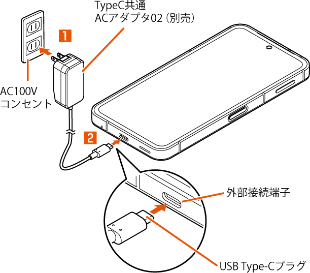 TypeC共通ACアダプタ02(別売)を接続して充電する方法を説明します。指定のACアダプタ(別売)について詳しくは、「周辺機器」をご参照ください。
