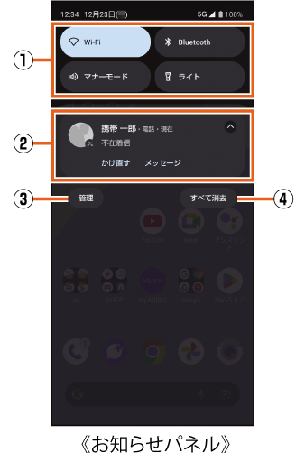 お知らせ/ステータスパネルでは、お知らせアイコンとステータスアイコンの確認や対応するアプリケーションの起動ができます。