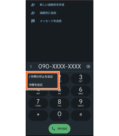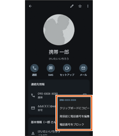 例:連絡先詳細画面で電話番号をロングタッチした場合