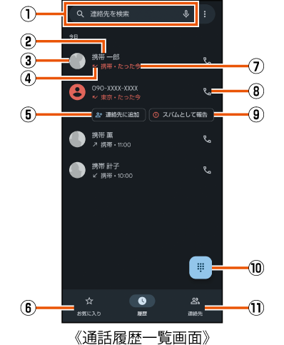 タップすると、連絡先への登録やメッセージの送信、通話履歴の詳細の確認などを行うことができます。