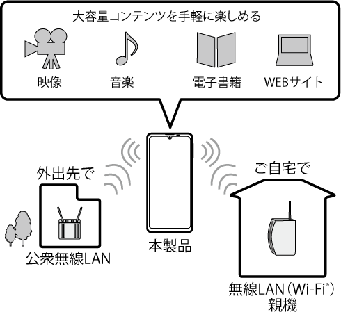 家庭内で構築した無線LAN(Wi-Fi®)環境や、外出先の公衆無線LAN環境を利用して、インターネットサービスに接続できます。