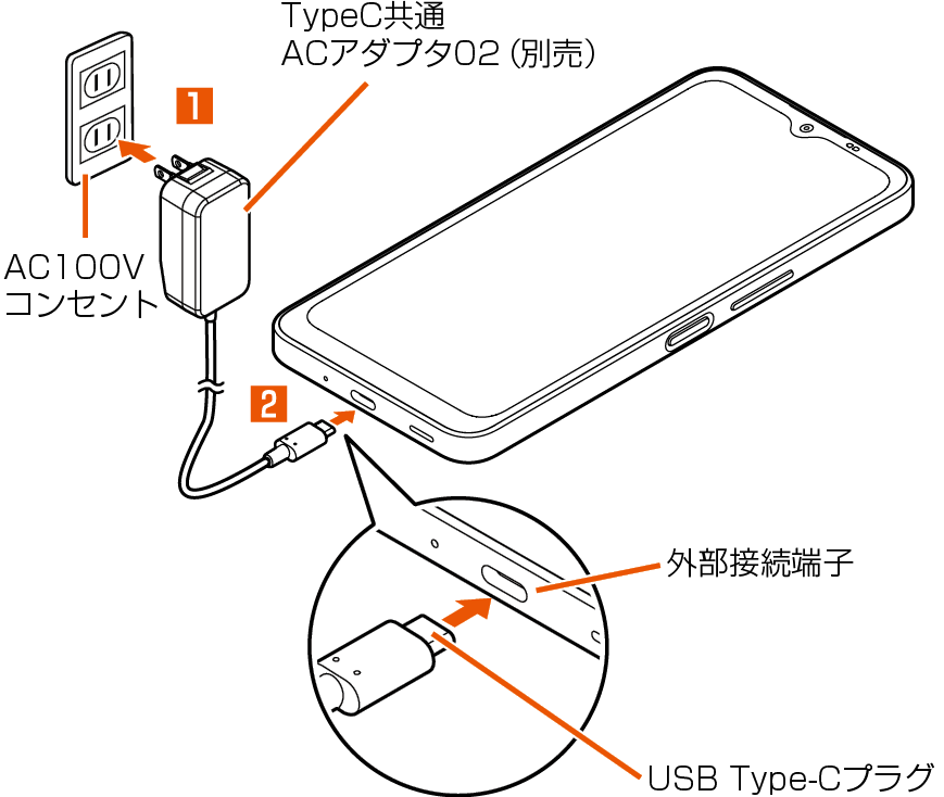 TypeC共通ACアダプタ02(別売)を接続して充電する方法を説明します。指定のACアダプタ(別売)について詳しくは、「周辺機器」をご参照ください。