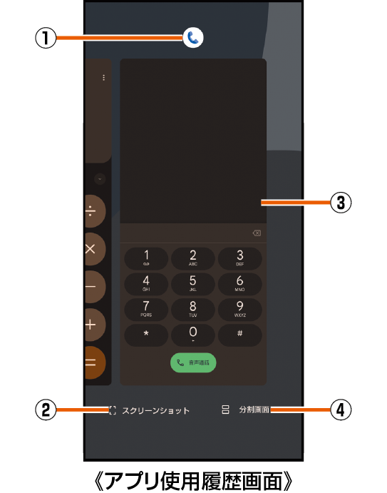 アプリ使用履歴画面中央に、分割画面上部で利用するアプリを表示→[分割画面]