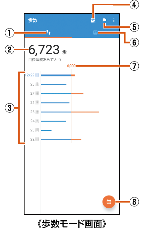 日々/月々の歩数が棒グラフで表示されます。グラフをタップすると、選択した日/月の歩数や歩行距離、消費カロリーなど、詳細情報が表示されます。
