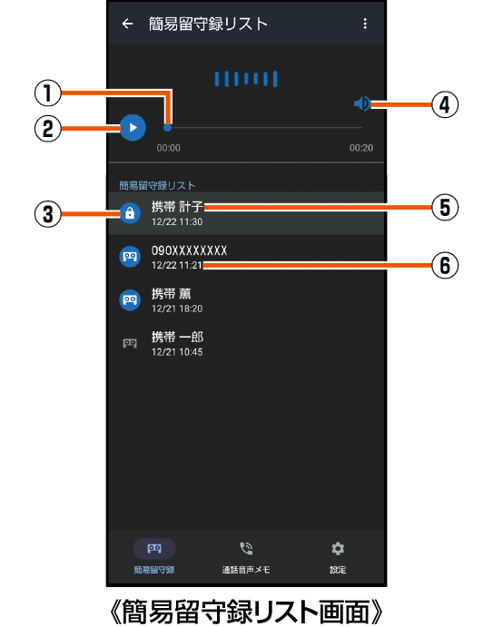 簡易留守録リスト画面/通話音声メモリスト画面が表示されます。