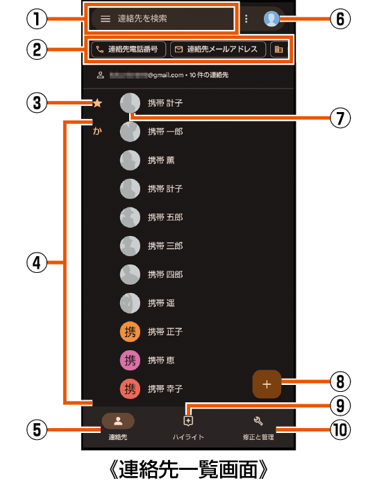 連絡先一覧画面の見かた