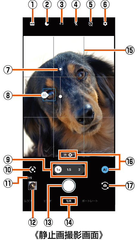 撮影モードを「写真」に設定している場合に表示されます。アイコンをタップすると、機能の有効(
