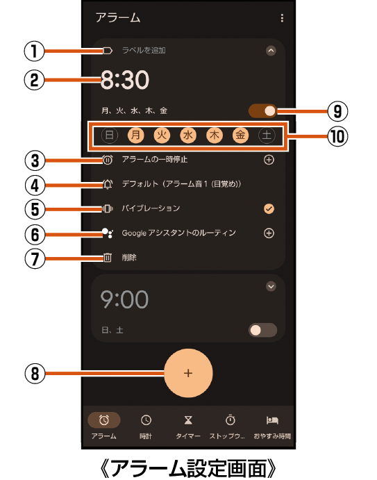 ホーム画面→「アプリ一覧画面」を表示→[時計]→[アラーム]