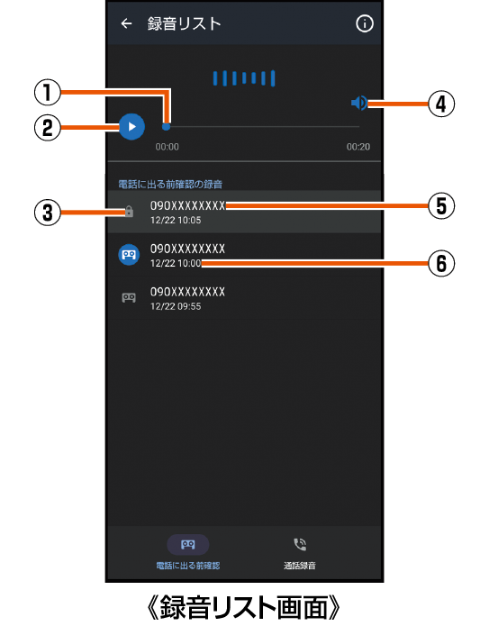 電話に出る前確認/通話録音の録音リスト画面が表示されます。