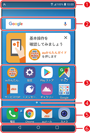 ステータスバー:着信やメールのお知らせを通知するアイコンや時刻、電波の強さなどの本製品の状態を表すアイコンが表示されます。