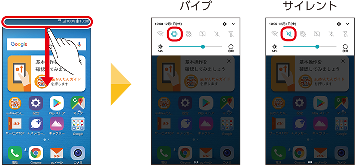 通知パネルのサウンドアイコンをタップしても、マナーモードに設定できます。