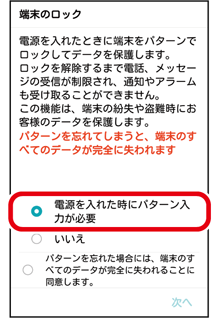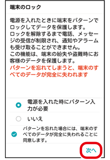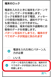 「パターンを忘れた場合には、端末のすべてのデータが完全に失われることに同意します。」をタップしてチェックを入れる