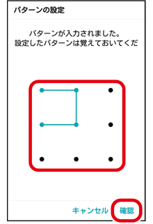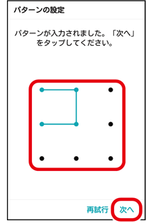 点と点をつなぐように指をスライドし、パターンを入力し、「次へ」をタップ
